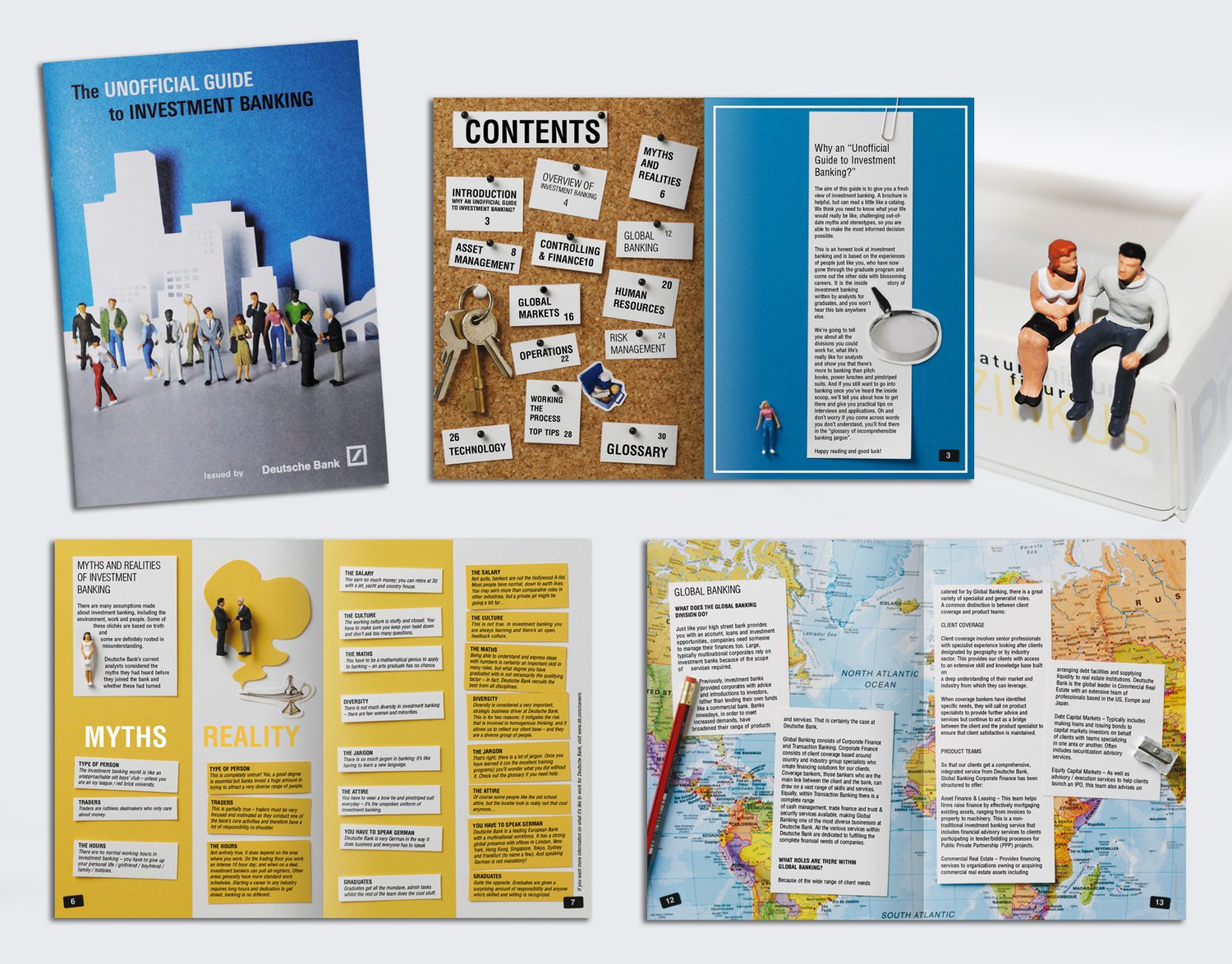 The Unofficial Guide to Investment Banking is a recruitment training brochure for Deutsche Bank. Contrary to conventional, corporate literature, the brochure was created like a scrapbook in oder to get a younger audience interested in the subject.